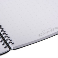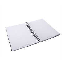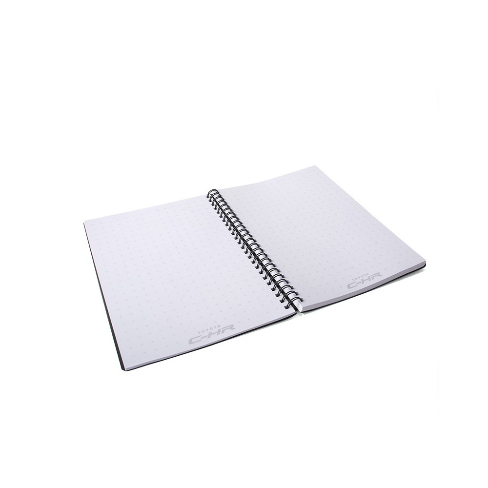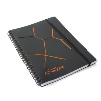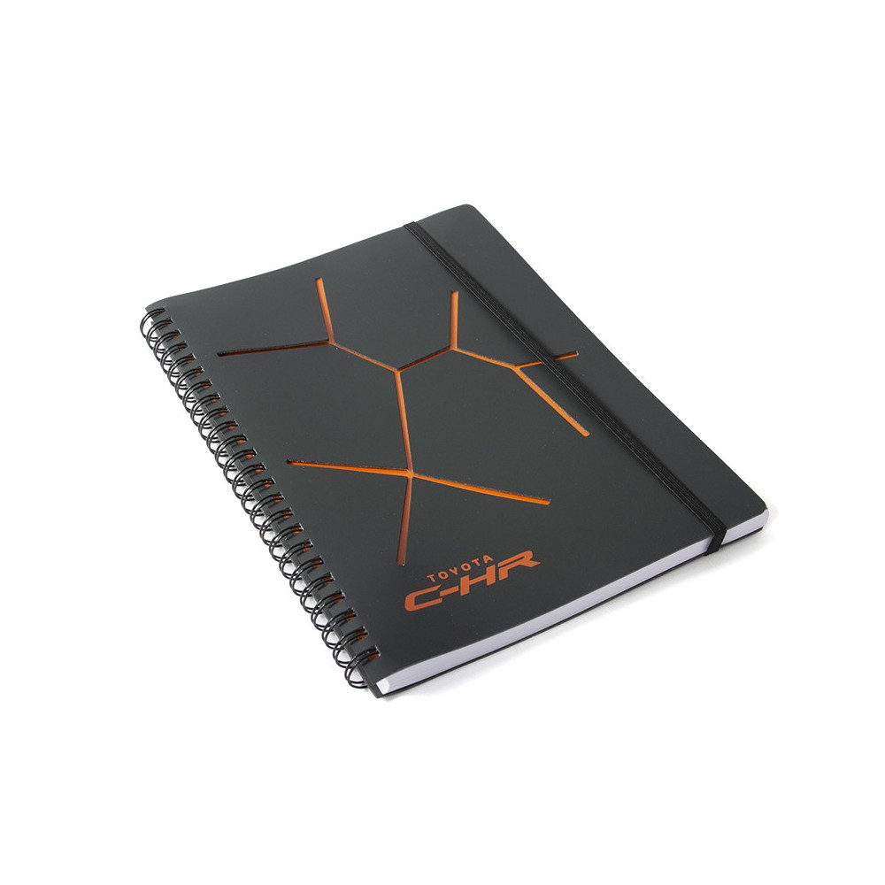 Блокнот формату А5 із чорної переробленої шкіри та з висічкою і принтом помаранчевого кольору знизу обкладинки.