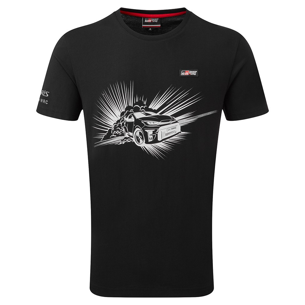 • Класична чорна футболка із зображенням автомобіля GR YARIS спереду та логотипами GR YARIS і BORN FROM WRC на лівому рукаві.