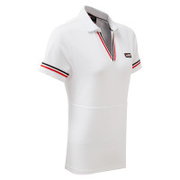 Біла спортивна футболка-поло з в’язаним коміром із червоними, білими та чорними смужками на манжетах і V-подібному вирізі.